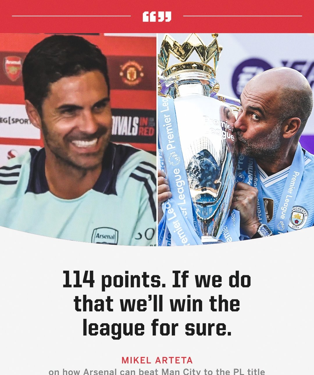 Vì vậy, vào mùa hè năm 2024, khi giới truyền thông hỏi Arteta làm thế nào để đánh bại Guardiola và giành chức vô địch, Tazigo thẳng thắn nói: "Thắng cả 38 vòng đấu và ghi 114 điểm là đủ"!