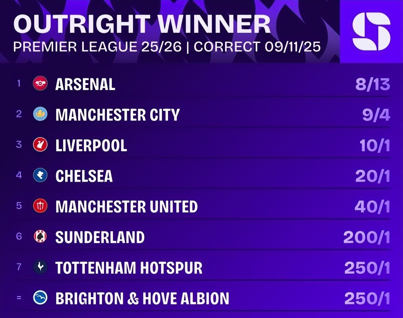 Arsenal, 13/8; Thành phố Manchester, 4/9; Liverpool là 10/1, trong khi Chelsea là 20/1.