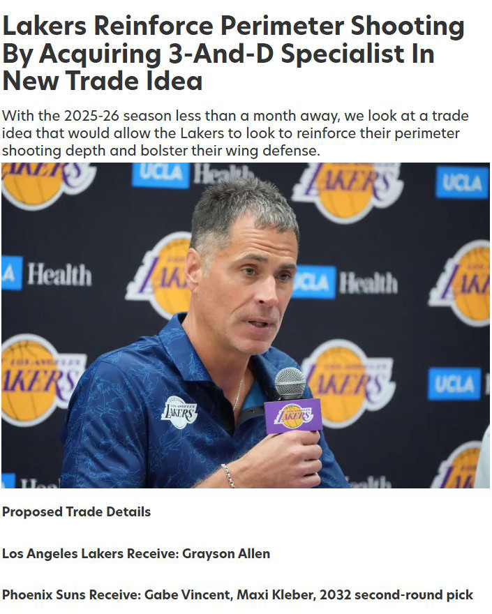 Có lẽ thấy ý tưởng tăng cường của Pelinka, phương tiện truyền thông "Fadeaway thế giới" của Hoa Kỳ cho rằng Lakers và Suns thực hiện giao dịch 3 đối với 1. Cụ thể, họ đã cho Vincent, Kleber và Grayson Allen vào vòng thứ hai sau 32 năm.