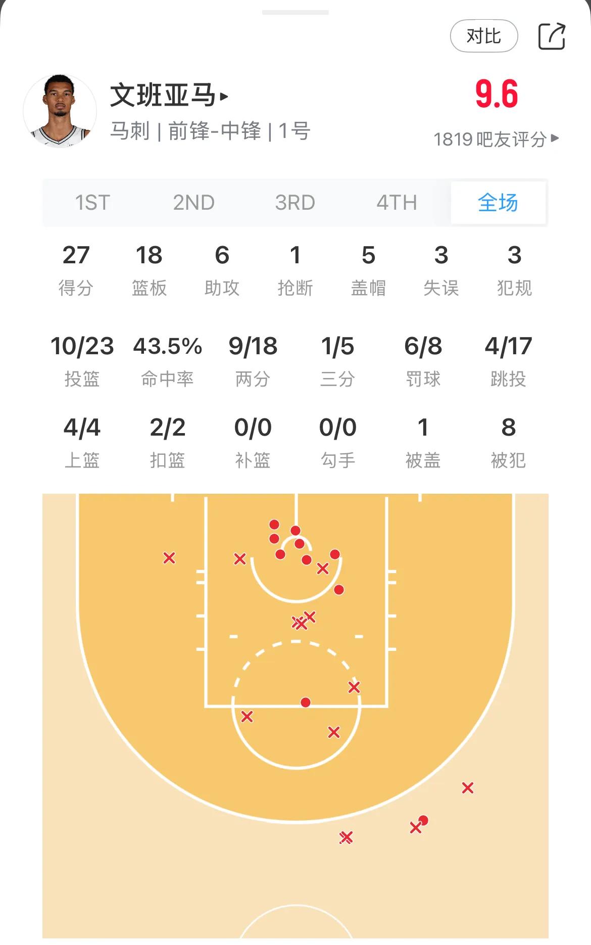 Sau khi xem trận đấu, bạn sẽ thấy rằng khả năng chạm bóng của Wenban hôm nay thực sự ở mức trung bình. Anh ấy thực hiện 1 trong 5 quả 3 điểm và tỷ lệ sút tổng thể là 43,5%. Heat đã cố gắng hết sức để hạn chế Wenban nhưng khả năng của anh quá mạnh. Anh ta đã bị vi phạm 8 lần trong trận đấu, cản phá 5 cú sút và bật lại 18 lần. Sức phòng thủ của anh quá mạnh!
