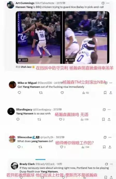 Màn trình diễn của anh ấy cũng thu hút bạo lực trực tuyến từ người hâm mộ ở Trung Quốc và Hoa Kỳ. Trước hết nhìn vào người hâm mộ Trung Quốc, họ ghét thép hơn thép. Là tuyển thủ thứ ba được chọn vào vòng một NBA, người hâm mộ Quảng Đông Trung Quốc đã đặt nhiều hy vọng vào anh. Thứ hai, màn trình diễn của anh không đáp ứng được kỳ vọng. Điều quan trọng là thái độ của anh ấy đối với trận đấu. Sau trận đấu vừa qua với Lakers, những bức ảnh Yang Hansen đưa bạn gái cùng đồng đội đến một nhà hàng Hàn Quốc để ăn thịt nướng đã bị lộ ra ngoài, điều này cũng làm dấy lên nhiều cuộc thảo luận sôi nổi trong dư luận.