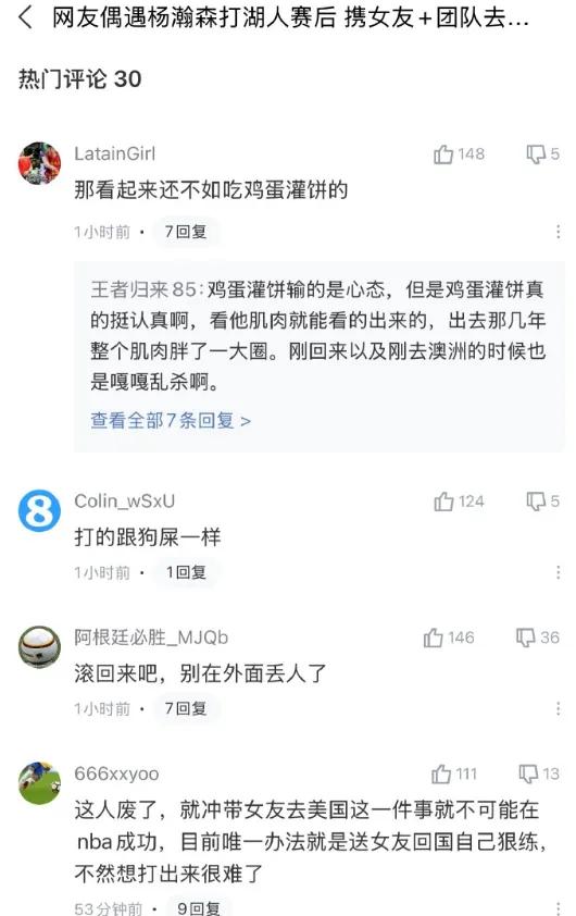Một số người hâm mộ cho biết: "Tôi có thời gian ăn thịt nướng với bạn gái nhưng không có thời gian tập luyện và tôi chơi dở tệ". "Yang Hansen thật vô dụng, cùng bạn gái của mình thi đấu tại NBA không thành công." Người hâm mộ rất tức giận vì sự thiếu kỷ luật của anh.