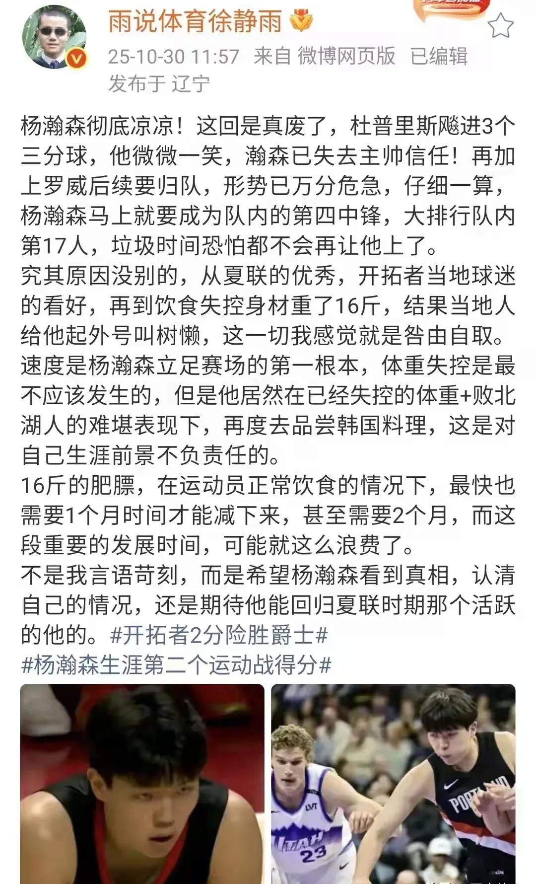 Trong 4 trận đầu tiên trong sự nghiệp NBA, Yang Hansen chơi trung bình 5 phút mỗi trận, nhưng về cơ bản anh ấy chỉ vào sân thay người trong hiệp một. Ban huấn luyện để anh ấy cảm nhận trận đấu và sau đó anh ấy được thay ra. Dữ liệu trò chơi cũng rất ảm đạm. Chỉ trong trận đấu với Lakers, Yang Hansen vào sân thay người trong 8 phút 36 giây, nhưng chỉ ghi được 1 điểm và 1 rebound trong pha sút 0 ăn 3. Màn trình diễn tổng thể tương đối chật vật, các pha tấn công và phòng ngự không thể theo kịp nhịp điệu NBA.