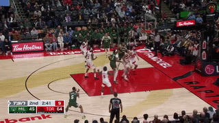 Bucks đối đầu với Raptors lần thứ hai trong mùa giải này. Tuy nhiên, sau 24-24, pha tấn công của Bucks không thành công và Raptors tung ra đòn tấn công 15-5. Sau hiệp đầu tiên, Bucks tụt lại phía sau 10 điểm. Antetokounmpo thực hiện 3 trong 5 cú sút trong hiệp 1 và ghi được 7 điểm, 1 rebound và 1 kiến tạo. Dù bị ba người vây quanh trong vòng cấm nhưng anh vẫn ghi được bàn thắng với tỷ số 2+1. Mục tiêu này quá vô lý.